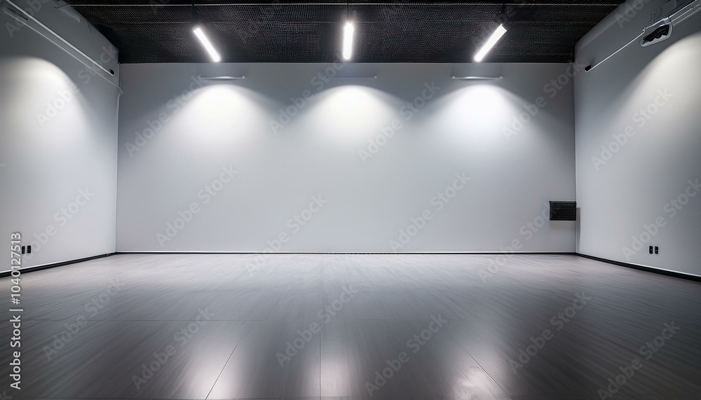 The watermark will not be included on Wall mural.: Minimalist studio setup with a smooth grey floor seamlessly transitioning into a white cyc wall dram
