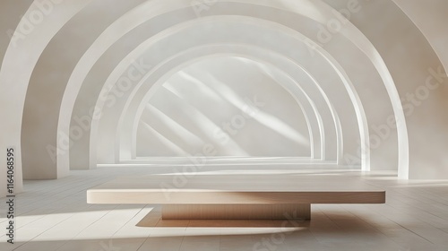 Minimalist wooden table in modern amphitheater setting ideal for product display with soft natural lWall mural