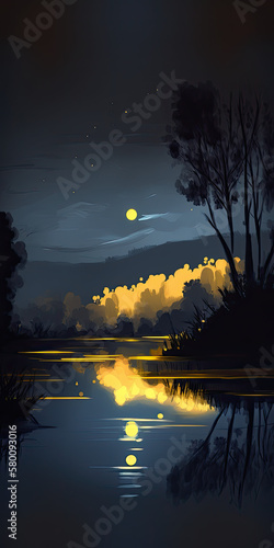 Minimalistic moon magic: a dark landscape with a water reflection created using generative aiWall mural