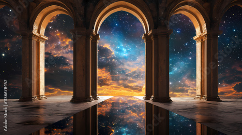 Wall mural mirrored galaxy archway twilight window reflection space landscape. mirrored. illustration