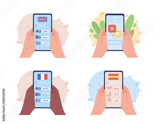 Wall mural mobile app for learning languages 2d vector isolated illustration set. flat first view hand on carto