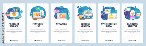 Mobile app onboarding screens - business strategy, new product release, data sync - menu vector bannerWall mural