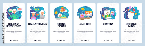 Wall mural : Mobile app onboarding screens - creativity, brainstorm, knowledge and education, boring lessons - menu