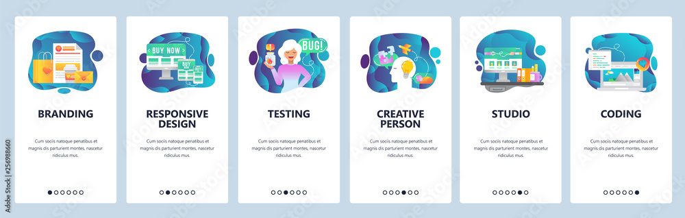 Wall mural : Mobile app onboarding screens - digital marketing, branding and design studio, creativity - menu vecto