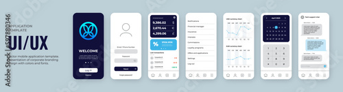 The watermark will not be included on Wall mural.: Mobile application design template - ui ux elements set with blue color logo and dark background - can