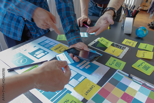 Wall mural : Mobile application development team is studying and designing ux ui system to display and color in a