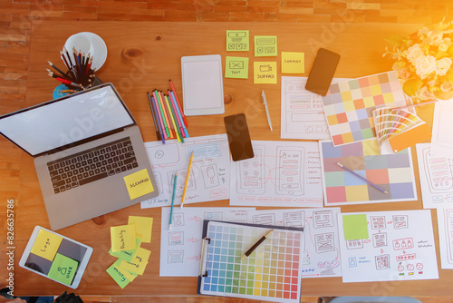 Wall mural : Mobile application development team is studying and designing ux ui system to display and color in a