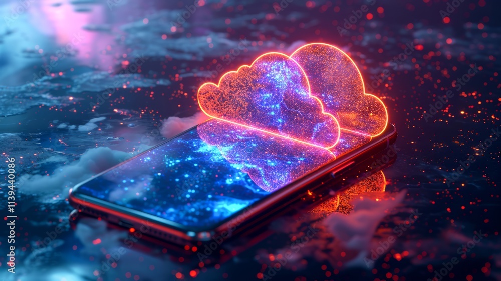 Wall mural mobile cloud computing idea showing a smartphone with a digital cloud neon icon emerging from the sc - Wall murals Wall mural mobile cloud computing idea showing a smartphone with a digital cloud neon icon emerging from the sc - Wall murals