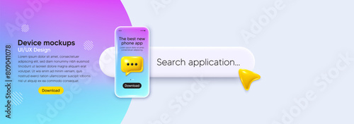 Wall mural mobile phone ui banner. search bar app interface template. phone mockup with 3d chat speech bubble b