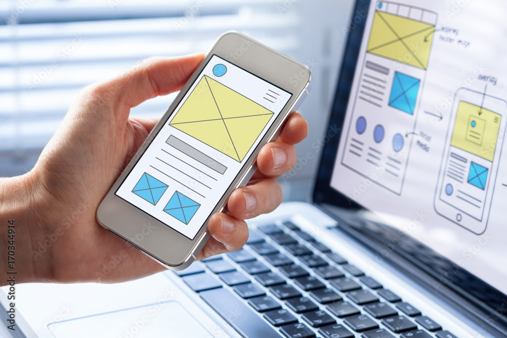 Mobile responsive website development, wireframe design preview on smartphone screenWall mural