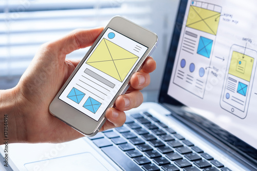 Wall mural mobile responsive website development, wireframe design preview on smartphone screen - Wall murals Wall mural mobile responsive website development, wireframe design preview on smartphone screen - Wall murals
