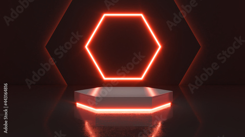 Wall mural mock up podium for product presentation,3d render,hexagonal mockup stand neon light background