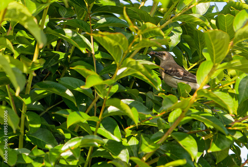 The watermark will not be included on Wall mural.: Mocking bird hidden in a crape myrtle tree eating an insect -