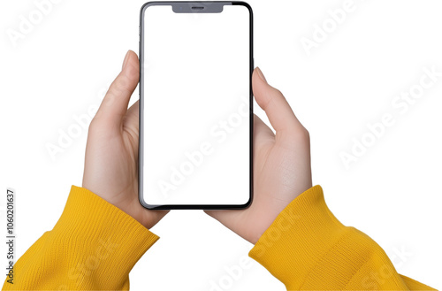 Wall mural mockup hand hold phone isolated on transparent background empty screen with clipping path, two hand
