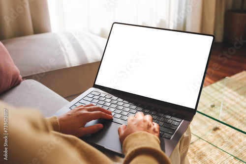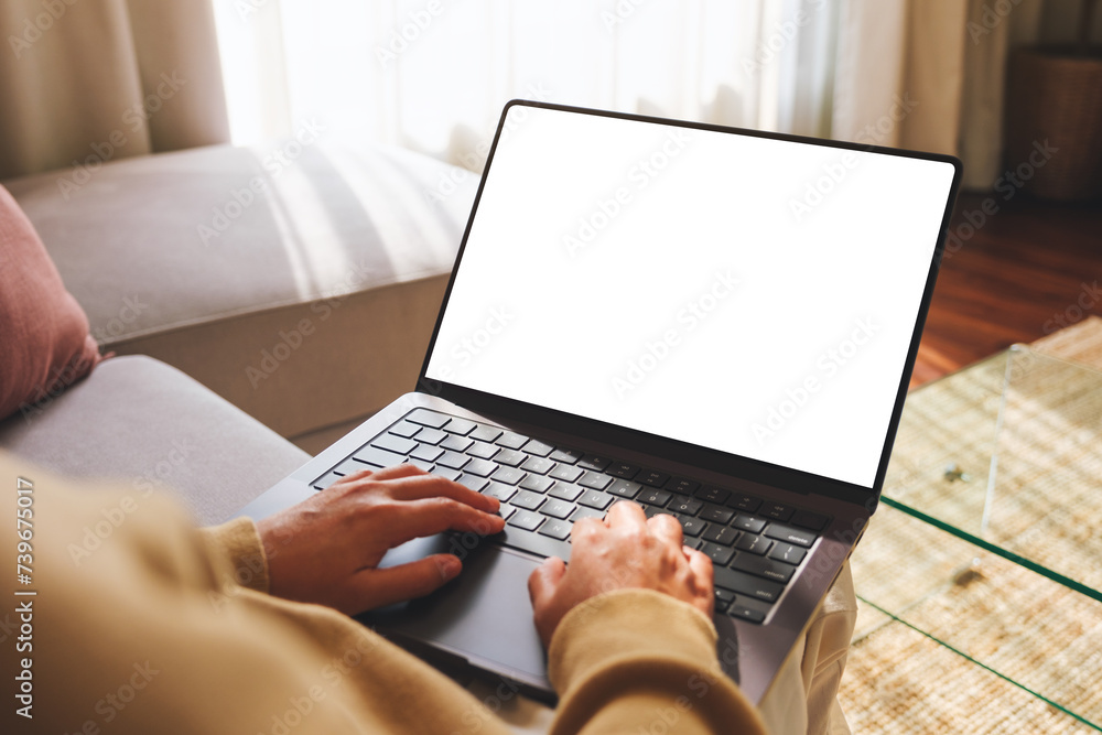 Wall mural : Mockup image of a woman working and typing on laptop computer with blank screen while sitting on sof