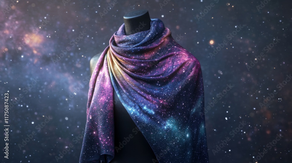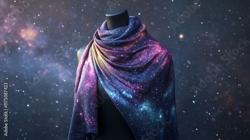 The watermark will not be included on Wall mural.: Mockup of a custom scarf with a galaxy pattern draped over a minimalist mannequin