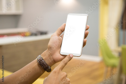 Wall mural mockup smartphone on businessman hands empty display on home table with blur background. - image - i