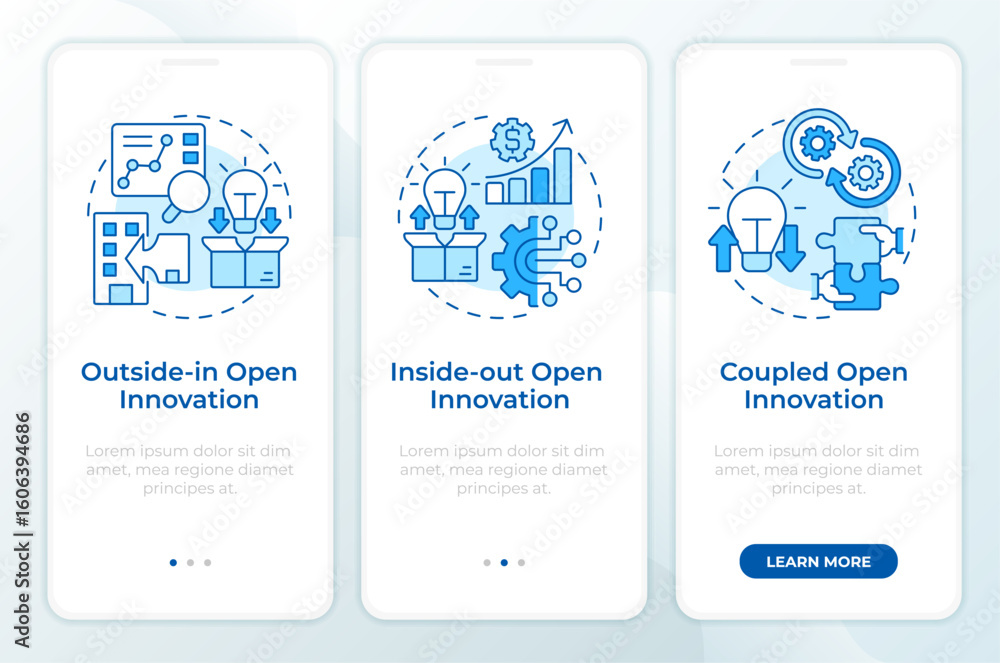 Wall mural : Models of open innovation blue onboarding mobile app screen - rd management - walkthrough 3 steps edit