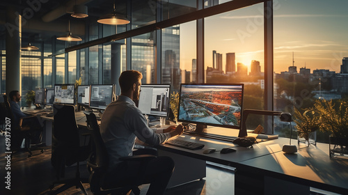 Wall mural modern and sleek office environment with a large window, natural sunlight to flood the space, and a