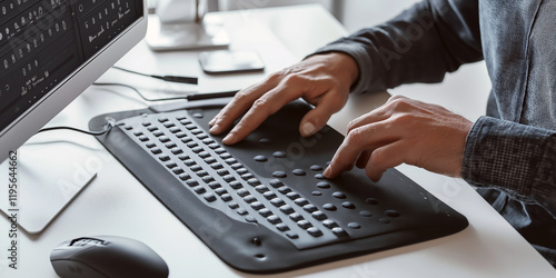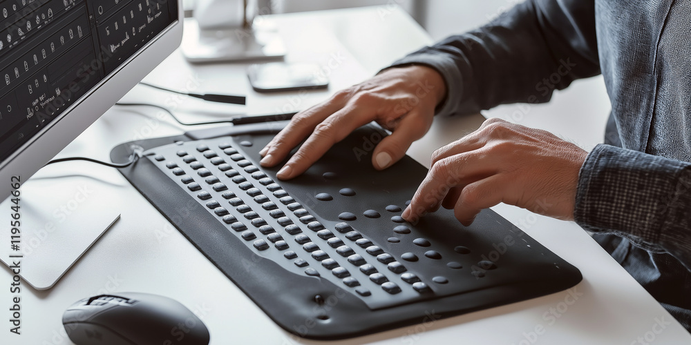 The watermark will not be included on Wall mural.: Modern braille display device connected to a computer, with a visually impaired person using it to r