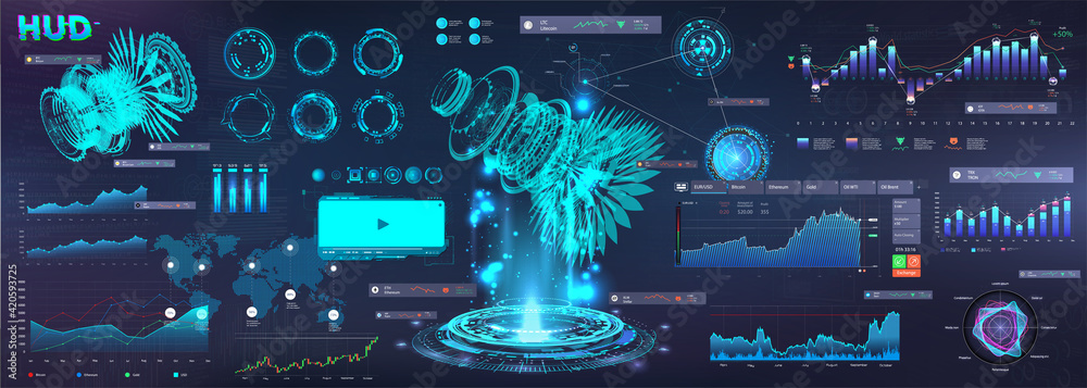Wall mural modern business elements ui, ux in hud style. futuristic user interface gui 3d objects, infographics - Wall murals Wall mural modern business elements ui, ux in hud style. futuristic user interface gui 3d objects, infographics - Wall murals