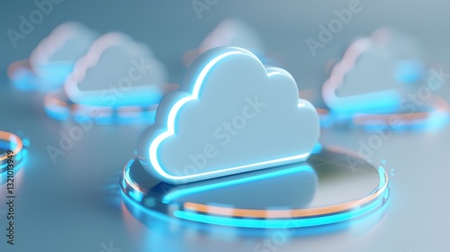 Wall mural : Modern cloud storage icon with neon glow and reflection on soft background for digital technology th