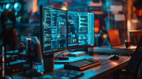 The watermark will not be included on Wall mural.: Modern coding workstation with dual monitors