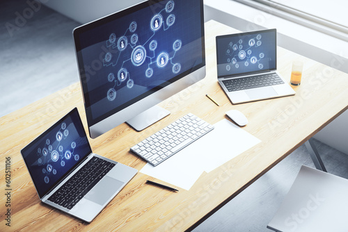 Wall mural modern computer display with social network icons concept. networking concept. 3d rendering - Wall murals Wall mural modern computer display with social network icons concept. networking concept. 3d rendering - Wall murals