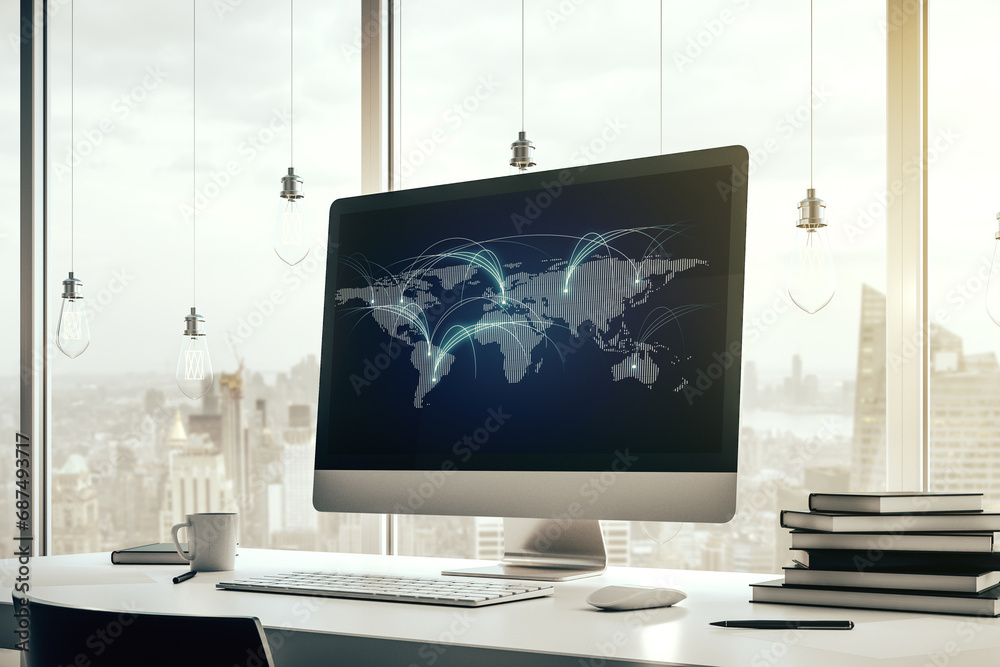 Wall mural modern computer monitor with abstract digital world map with connections, research and strategy conc - Wall murals Wall mural modern computer monitor with abstract digital world map with connections, research and strategy conc - Wall murals