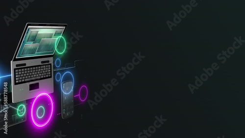 Modern computer technology work devices network in background animation in front of blackish backdroWall mural