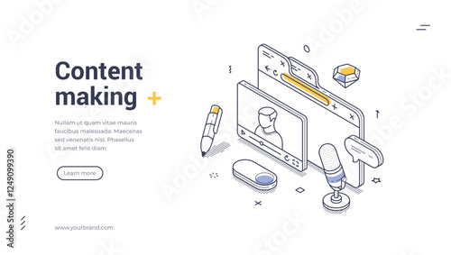 Modern content maker web banner - creative digital workspace showcasing elements such as a microphoneWall mural