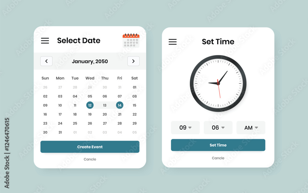 The watermark will not be included on Wall mural.: Modern date and time selection ui kit design for mobile and web applications