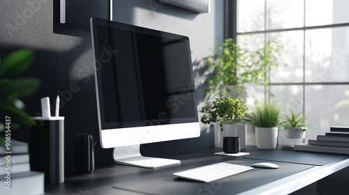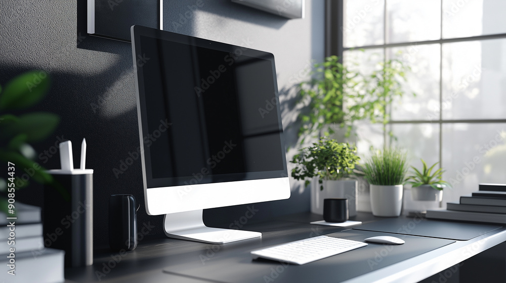 The watermark will not be included on Wall mural.: Modern desktop computer setup for professional work