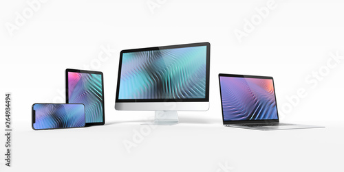 Wall mural : Modern devices with smartphone laptop computer and tablet aligned and isolated on white mockup 3d re