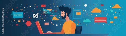 The watermark will not be included on Wall mural.: Modern digital illustration of a programmer working at a laptop, surrounded by code and technology e