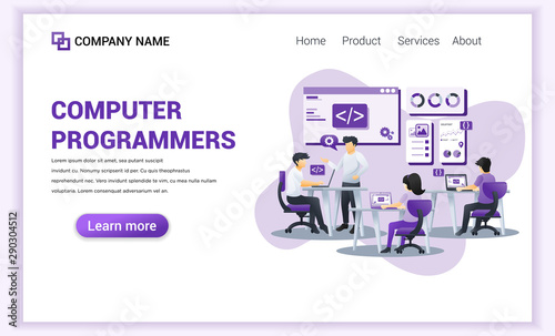 Wall mural : Modern flat design concept of computer programmers with characters sitting at desk as programmer and