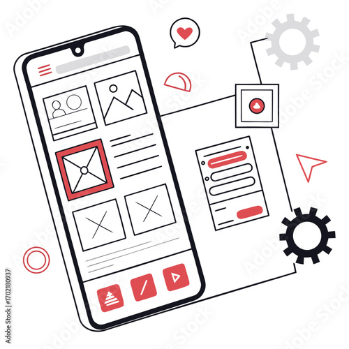 Wall mural modern flat design illustration of a smartphone displaying a wireframe layout with user interface el - Wall murals Wall mural modern flat design illustration of a smartphone displaying a wireframe layout with user interface el - Wall murals