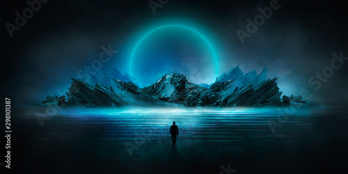 Wall mural modern futuristic neon abstract background. large object in the center, space background. dark scene