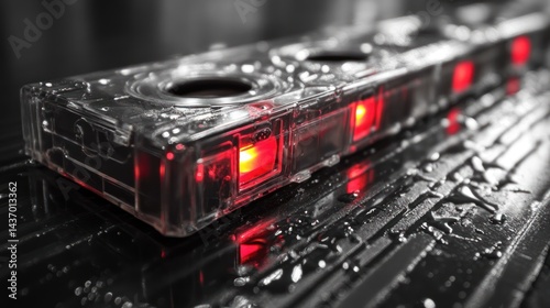 Wall mural modern geometric clear block adorned with red neon illumination on wet surface