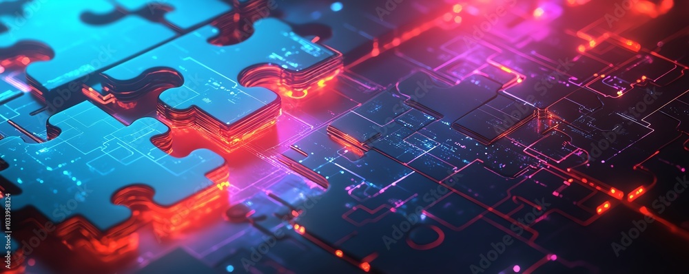 Wall mural modern graphic representation of api integration, showcasing interlocking puzzle pieces with glowing - Wall murals Wall mural modern graphic representation of api integration, showcasing interlocking puzzle pieces with glowing - Wall murals