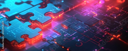 The watermark will not be included on Wall mural.: Modern graphic representation of api integration, showcasing interlocking puzzle pieces with glowing