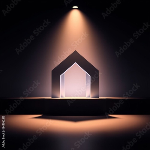The watermark will not be included on Wall mural.: Modern illuminated house sculpture in a dark setting showcasing minimalistic design and depth of lig