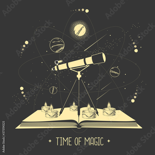 Wall mural modern magic witchcraft open book with telescope and outer space and planets. vector illustration