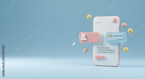 Modern mobile messaging app interface design 3d render of a smartphone with chat bubbles and user icWall mural