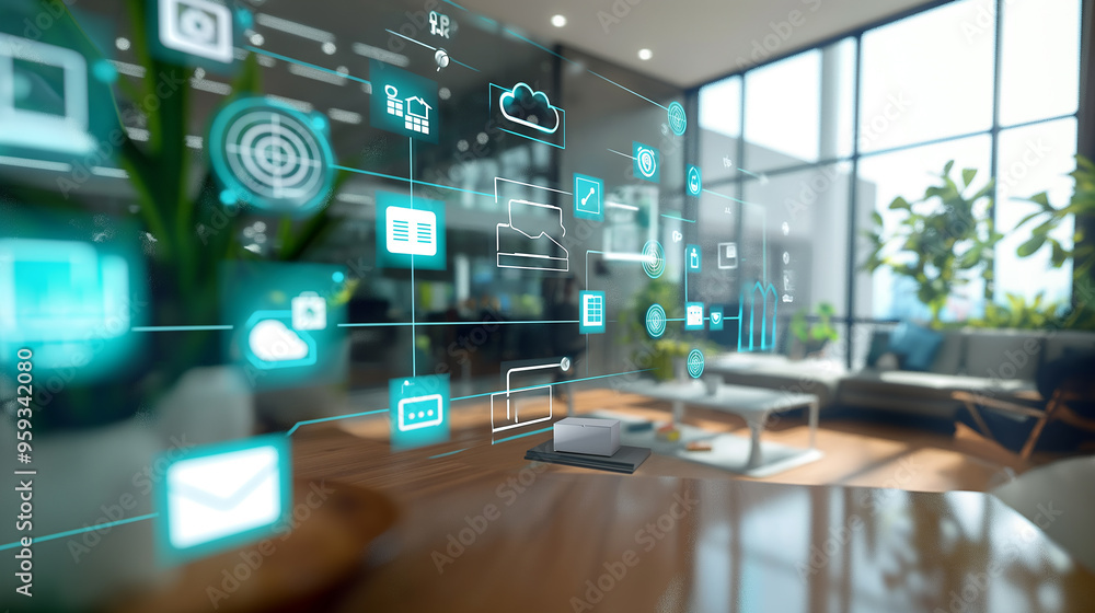 The watermark will not be included on Wall mural.: Modern office communications network management system visualization through virtual display of icon