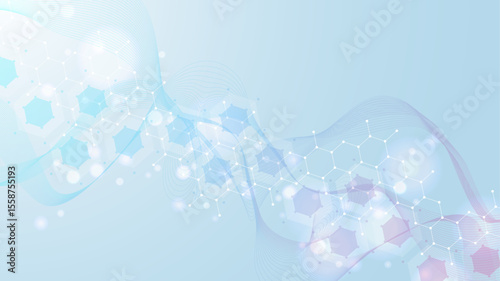 Wall mural : Modern scientific background with hexagons, lines and dots - wave flow abstract background - molecular