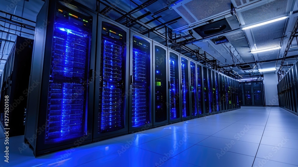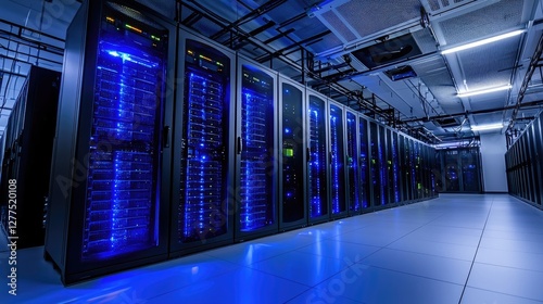 Wall mural modern server room with glowing blue data racks, showcasing cloud computing, cybersecurity, and digi