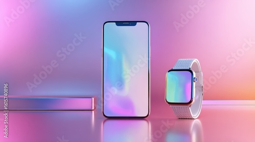 The watermark will not be included on Wall mural.: Modern smartphone and smartwatch mockup on pink background elegant tech devices display perfect for