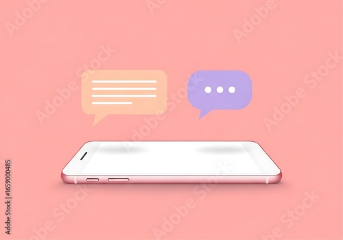 Wall mural modern smartphone displaying chat bubbles with communication icons on a soft pink background - Wall murals Wall mural modern smartphone displaying chat bubbles with communication icons on a soft pink background - Wall murals
