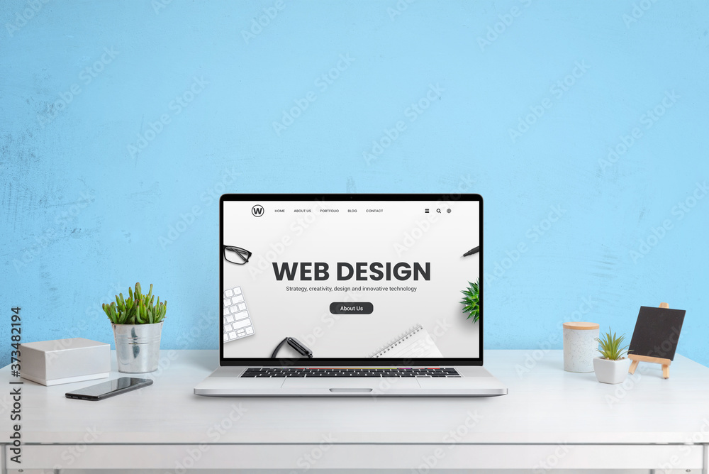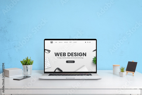 Wall mural modern website of web design company presented on a laptop computer. modern work desk with blue wall
